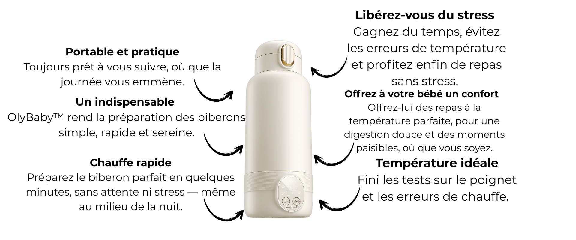 OlyBaby™ est équipé d’un écran LED intuitif qui vous permet de choisir et de contrôler précisément la température souhaitée. Une fois atteinte, il maintient le lait à la température idéale sans risque de surchauffe.